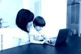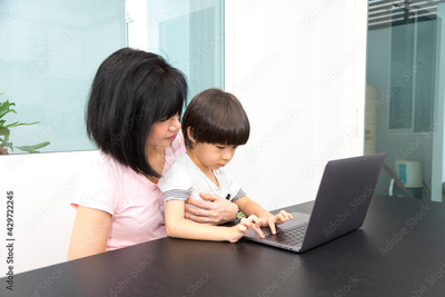 Asian woman with a child works on computer. Concept of work from home and home family education. Mom and son are working on a laptop at home.