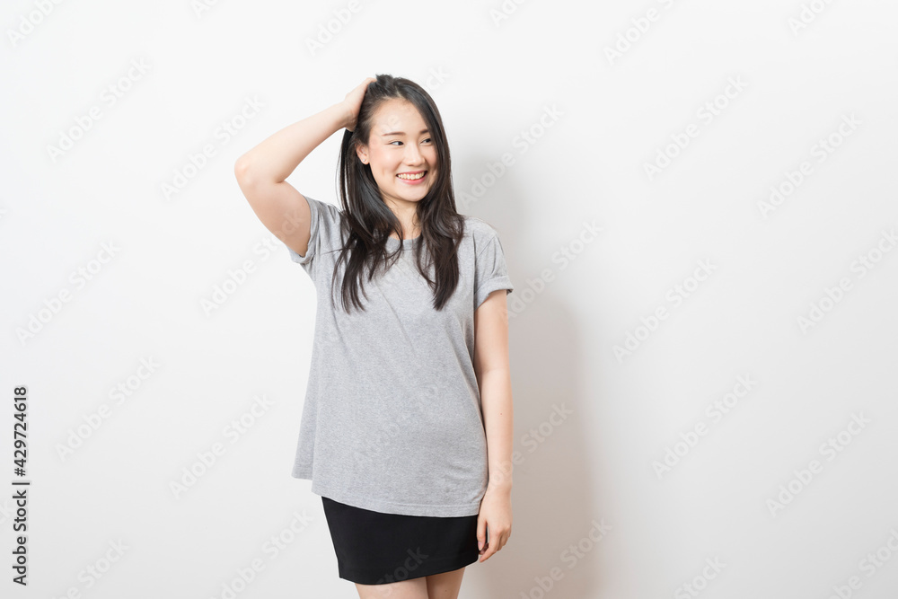 Portrait of happy young asian woman wearing grey shirt smiling at camera while standing over white background.