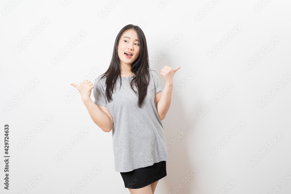 Portrait of happy young asian woman wearing grey shirt smiling at camera while standing over white background.