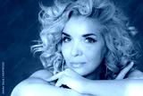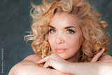 Beautiful spectacular sexy 40 years old blonde with curly hair in a natural nude image with bare shoulders at a white table at home portrait large.
