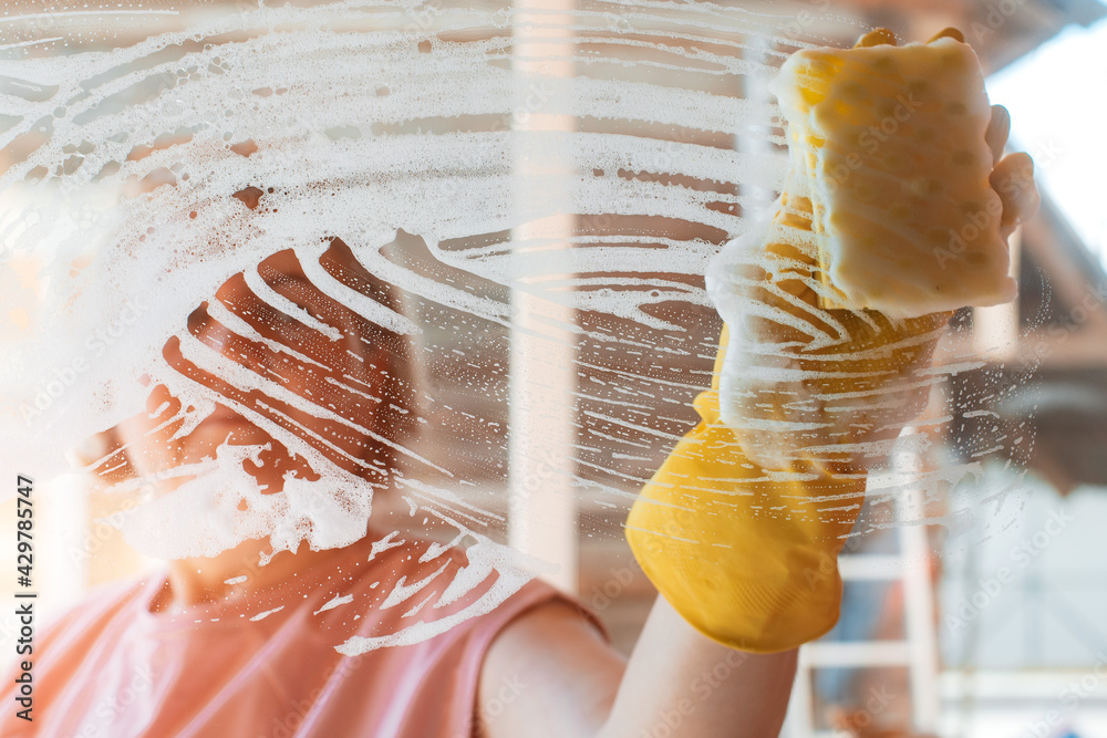 woman does household chores at home, washing the surfaces of mirrors and windows with a spray of detergent with a foam sponge.