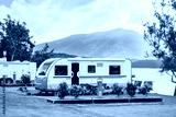 RV caravan camping at the caravan park on the lake with mountains on the horizon. Camping vacation travel concept
