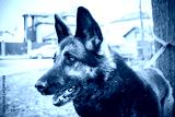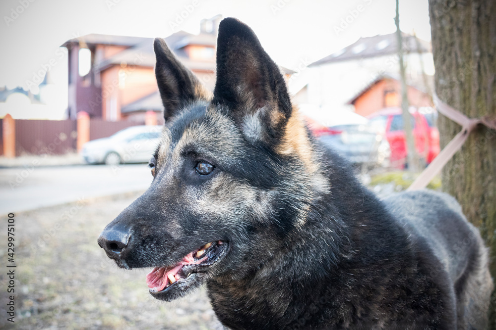 Head of gray-brown shepherd dog in the street, portrait in half a turn