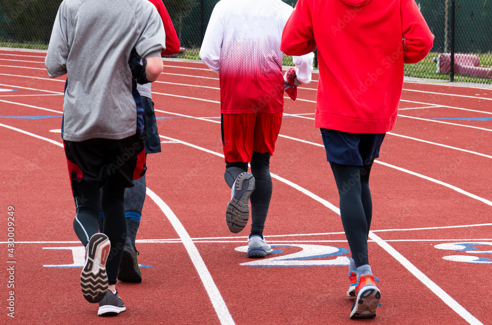 Boys running on a track in a group