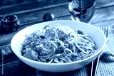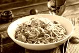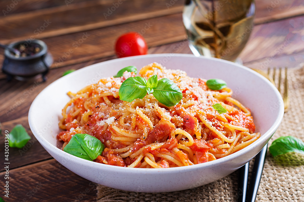 Spaghetti alla Amatriciana with guanciale, tomatoes and pecorino cheese. Italian healthy food.