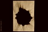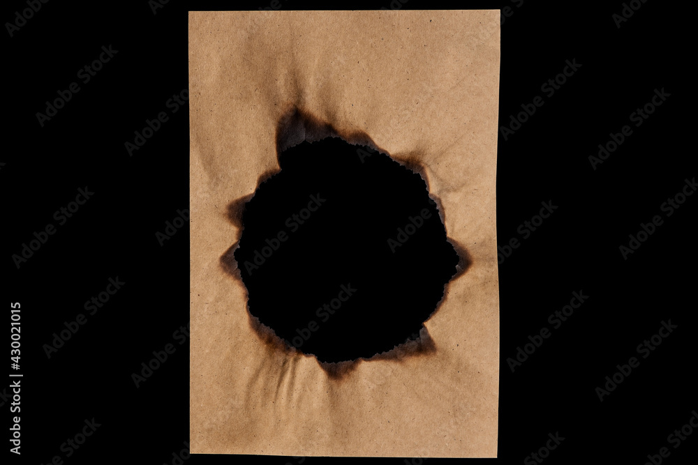 Vintage paper with a burned round hole in the middle with black background. Isolated on black.