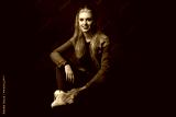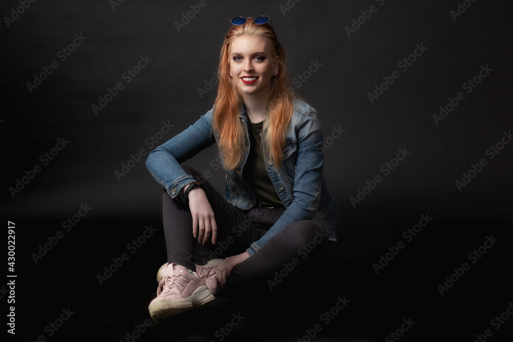 Smiling attractive young woman with sunglasses on her head is sitting on the black background. Horizontally.