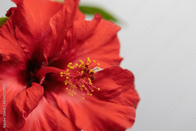 Red hibiscus flower closeup. Focused on stamens. Horizontally.