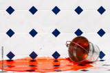 A colored liquid flows out of a metal bucket on a white tiles.