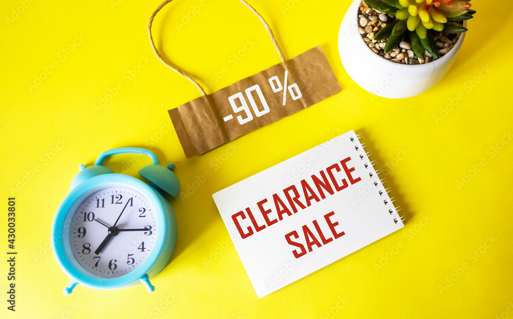 On a yellow background, the text CLEARANCE SALE 90 percent, an alarm clock and a cactus nearby.