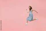 Full length side view young sporty fun smiling happy overjoyed caucasian woman in summer clothes striped dress straw hat jump high run fast hurrying up isolated on pastel pink color background studio.