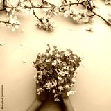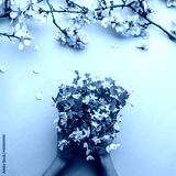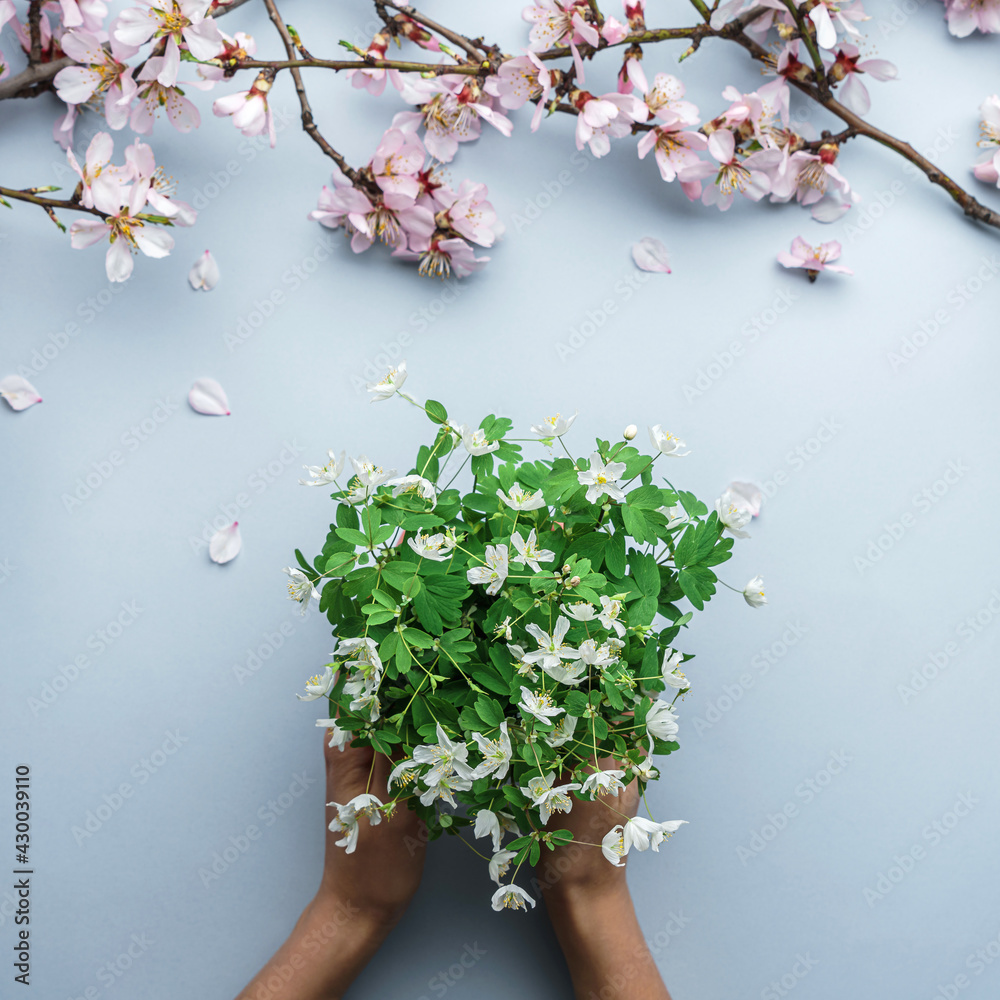 Hands holding bouquet of spring flowers on blue light background with blossoming branches sakura. Happy Easter holiday, top view