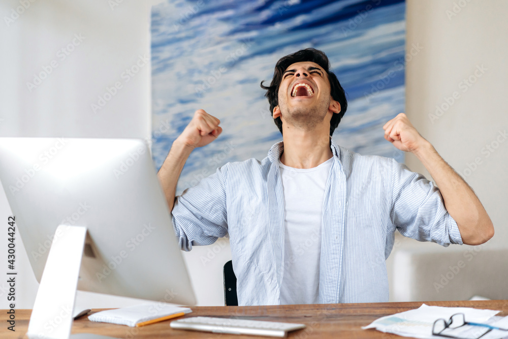 Joyful successful young Hispanic man, businessman, manager or freelancer, in stylish clothes, working at the computer, happy with victory, win or big profit, gesturing with his hands, shouting happily