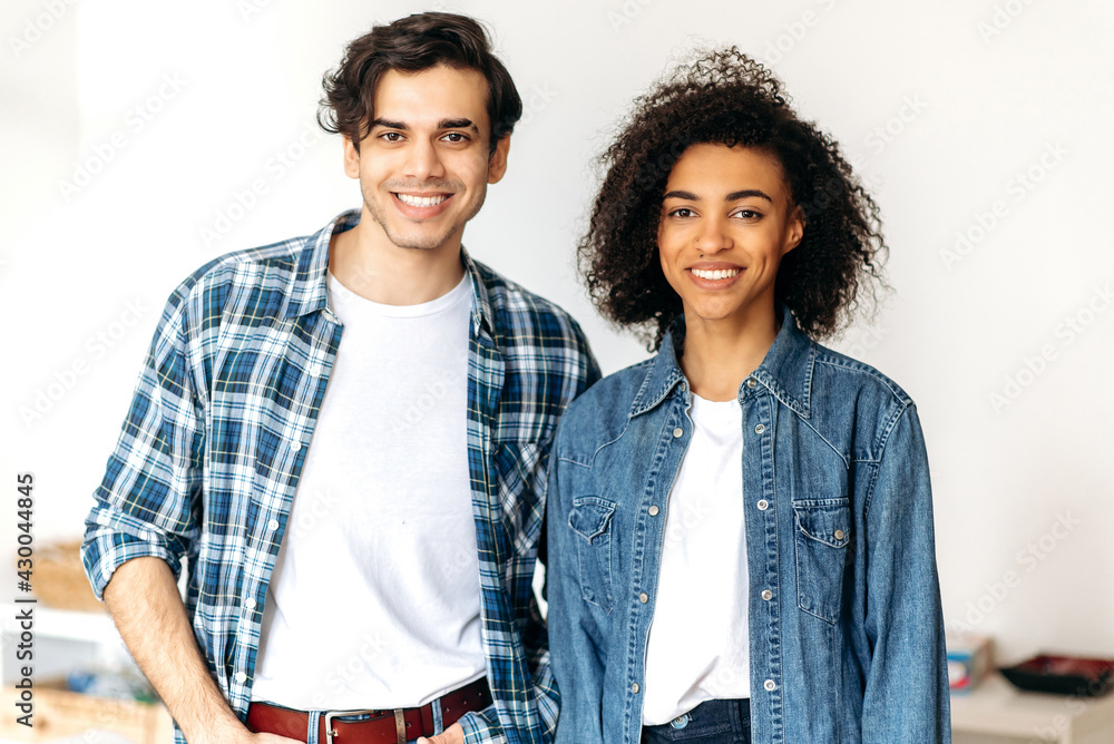 Portrait of young happy modern interracial married couple, happy family, in casual stylish clothes, looking at camera, smiling. Hispanic guy and African American curly haired girl