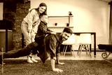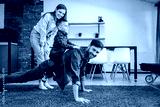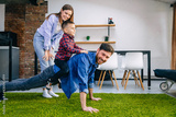 Happy funny family. son playing with father at home, young dad crawling on the floor carrying cute little baby on his back, giving the baby a ride on his back, having fun together.