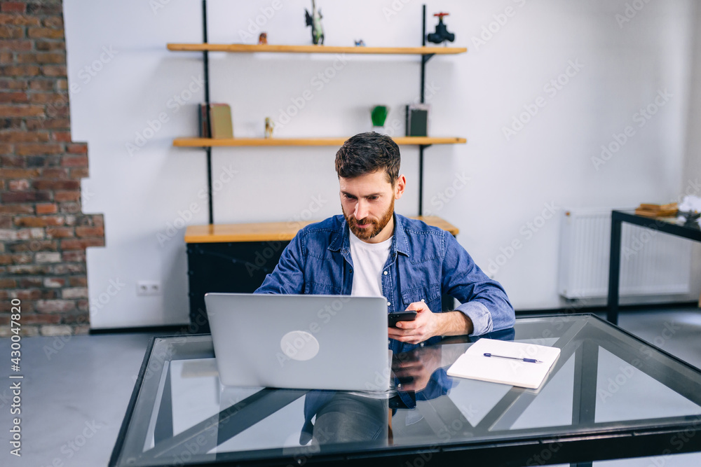 Young serious bearded businessman working on computer, holding smartphone, thinking. Man analyzes data, information, planning. Freelancer working at home.Online marketing, education, e-learning.