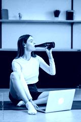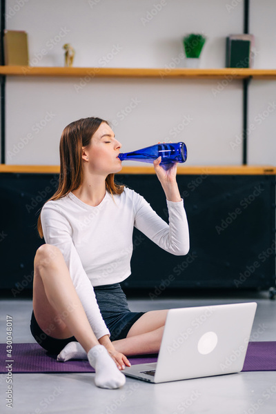 woman drinks water after intense exercise at home. Sitting in front of a laptop.