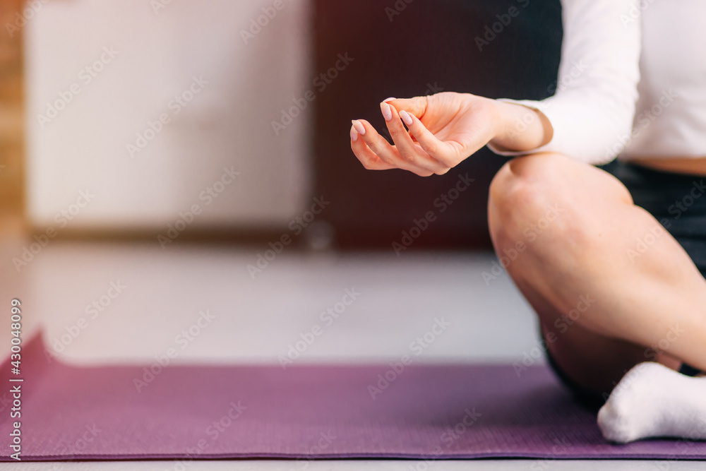 woman practicing yoga lesson, breathing, meditation, doing exercises, half lotus pose with mudra gesture, workout.