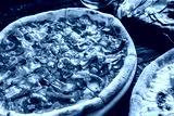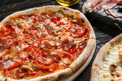 Pizza Pepperoni with prosciutto, sausage, cucumbers, cheese, tomatoes on dark wooden background. Fast food lunch for picnic company, closeup, selective focus