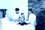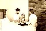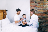 female pediatrician examining stethoscope child boy patient visiting doctor with dad, pediatrician checking child's heart lungs doing pediatric examination in hospital children health care concept
