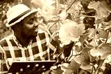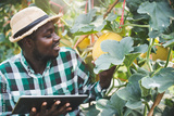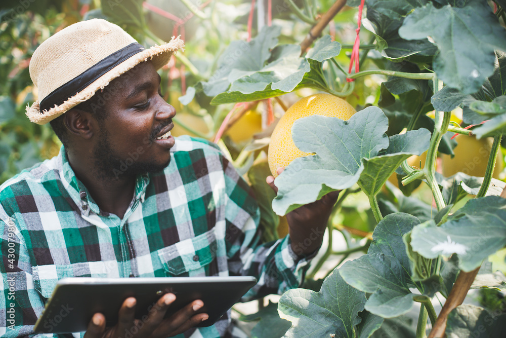African farmer using tablet for research the melon in organic farm.Agriculture or cultivation concept