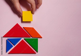 House of colorful tangrams in pink background