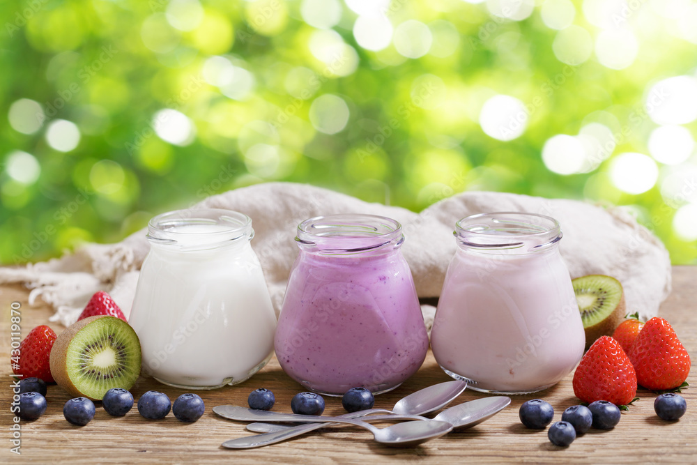various glass jars of yogurt with fresh berries