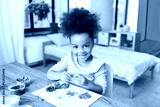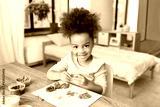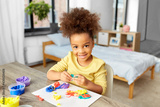 childhood, creativity and hobby concept - little african american girl with modeling clay playing at home