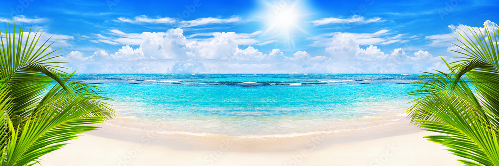 Beautiful tropical sand beach panorama view turquoise sea water ocean wave green palm tree leaves sun blue sky white cloud, summer holidays exotic island vacation, Caribbean travel, Maldives landscape