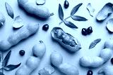 Ripe tamarinds and fresh leaves on beige background, flat lay