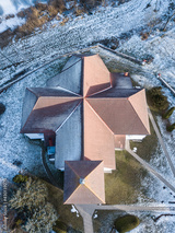 Aerial view of Alsunga catholic chursh in winter, Latvia.