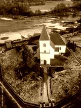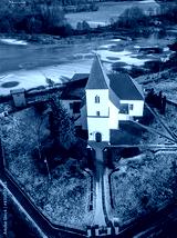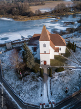 Aerial view of Alsunga catholic chursh in winter, Latvia.
