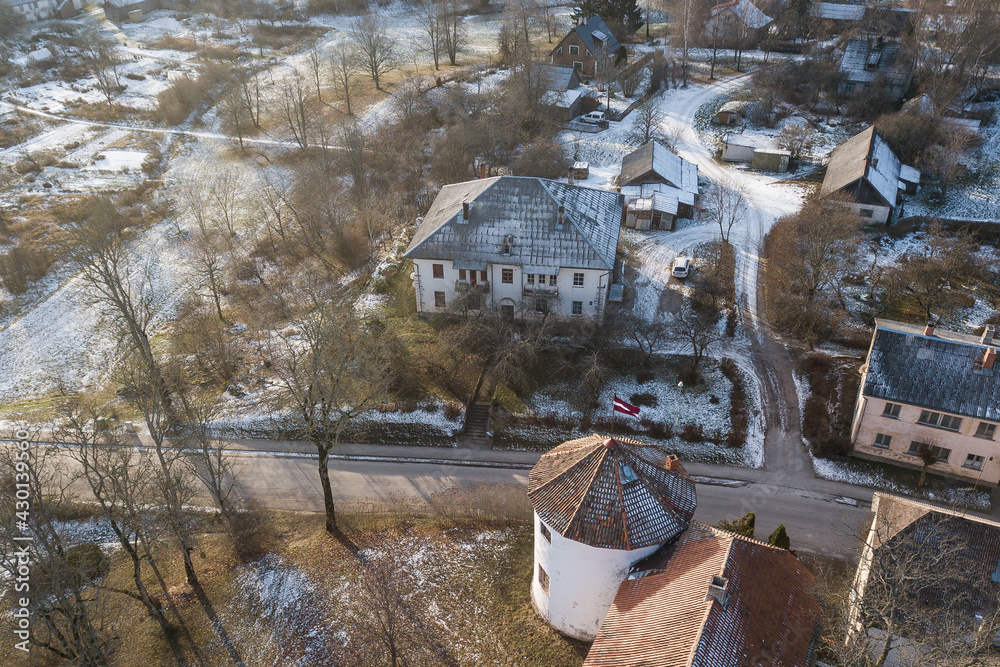 Aerial view of Alsunga Livonian Order castle in winter, Latvia.