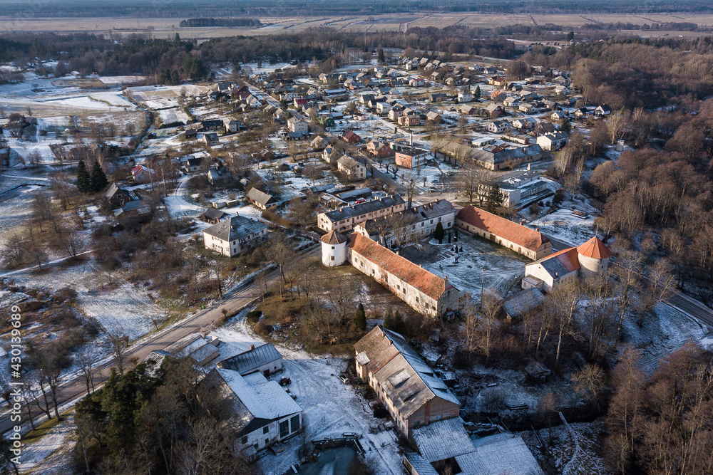 Aerial view of Alsunga Livonian Order castle in winter, Latvia.