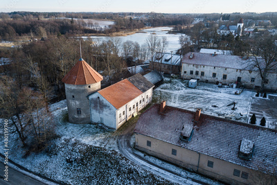 Aerial view of Alsunga Livonian Order castle in winter, Latvia.