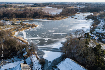Aerial view of Alsunga village in winter, Latvia.