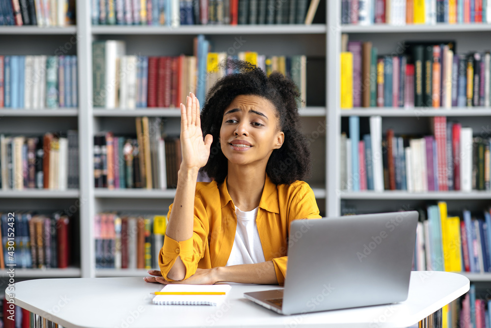 Smart confident beautiful mixed race student during lecture sits at the table in casual stylish clothes, raises her hand, knows the answer to the question and has an idea, wants to answer