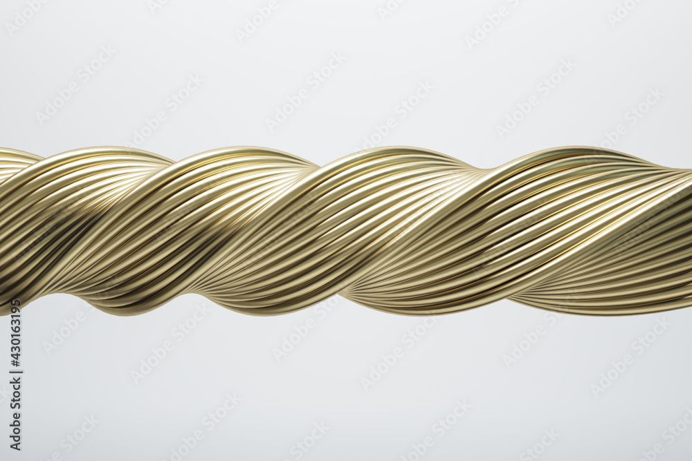 Golden spiral pattern made of multiple wires on a white background. Wallpaper and background presentation design concept, 3d rendering