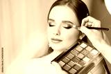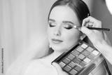 Wedding Make up Artist making Professional Bride Makeup. Bridal Eyeshadow Palette. Wedding Cosmetics Salon Face. Close up Beauty Bride Face Closed Eyes