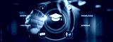 E-learning Online learning distance education concept. Businessman pressing button on screen