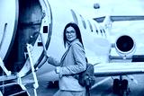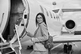 Happy caucasian beautiful dark hair businesswoman is boarding a private jet