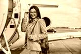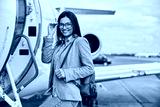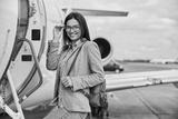 Happy caucasian beautiful dark hair businesswoman is boarding a private jet