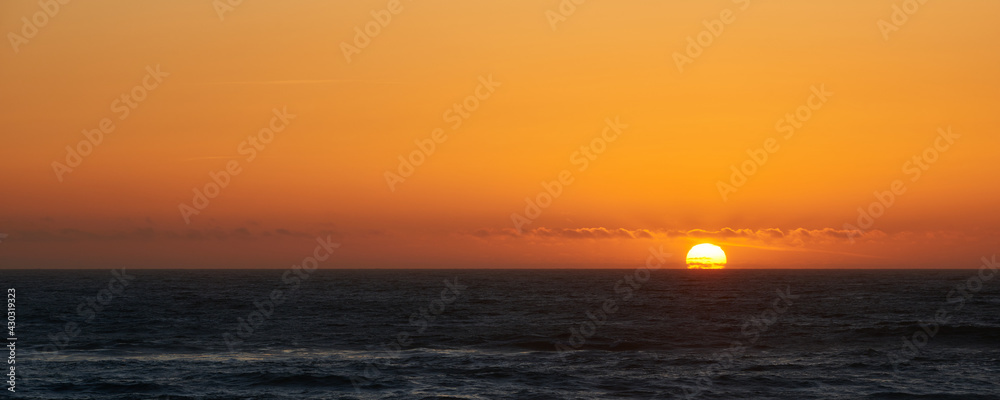 Sunset view and the sun touching the ocean surface near Lincoln city in Oregon.