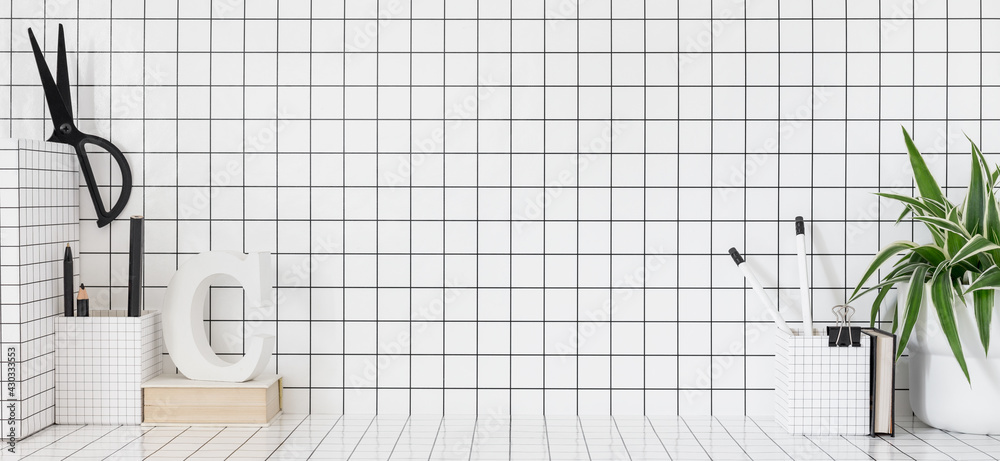 Desk with drawing supplies and cactus against bright wall. Creative workspace.