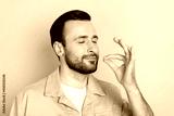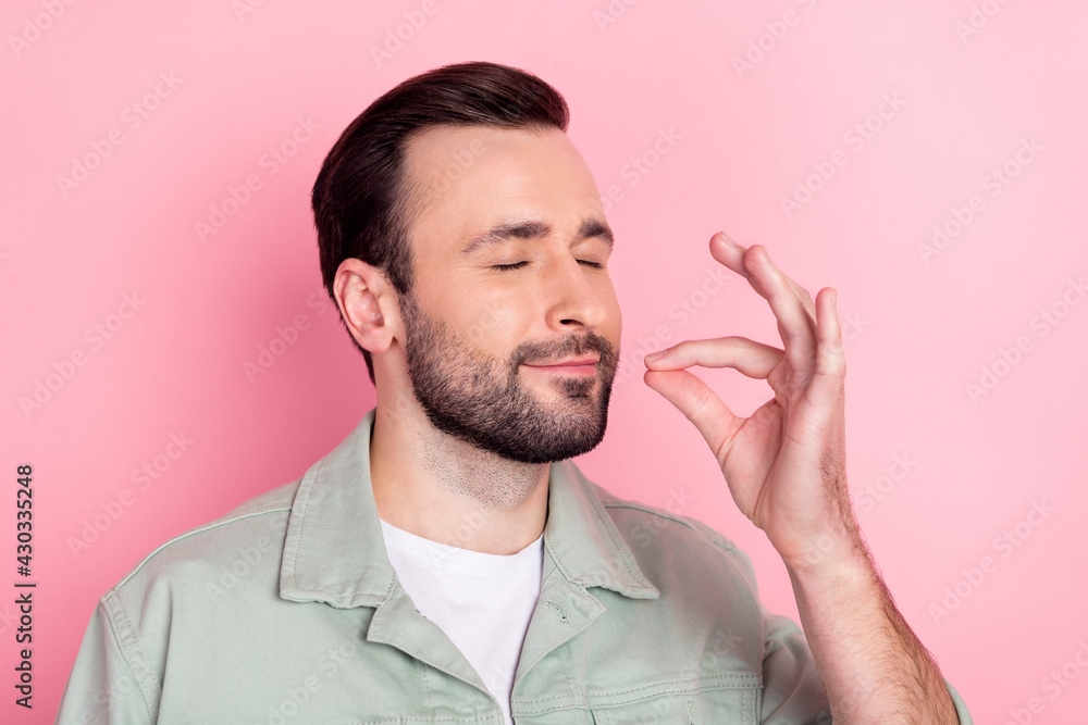 Photo of nice optimistic brunet man try food wear grey shirt isolated on pastel pink color background