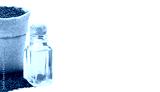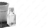 Black sesame essential oil. Glass bottle of black sesame oil. Black sesame in a sack of isolated on a white background. Black sesame in a burlap sack. Healthy food.Vegan food. Copy space