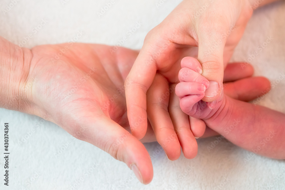 Father's ander mother's hand holding the hand of the newborn baby