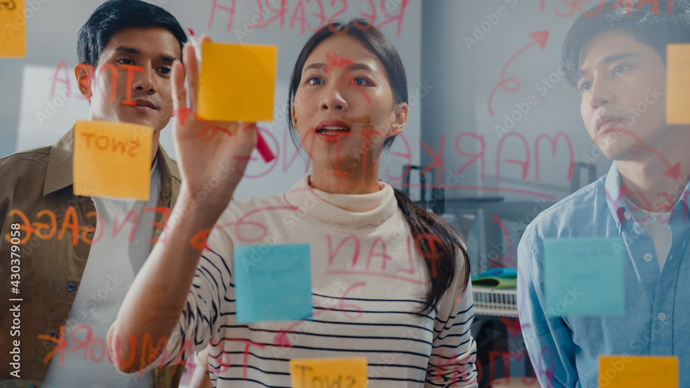 Asia businesspeople stand behind transparent glass wall listen manager pointing progress work and brainstorm meeting and worker post sticky note on wall at office. Business inspiration, Share ideas.