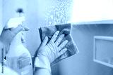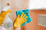 woman does household chores at home, washing the surfaces of mirrors and windows with a spray of detergent with a foam sponge.