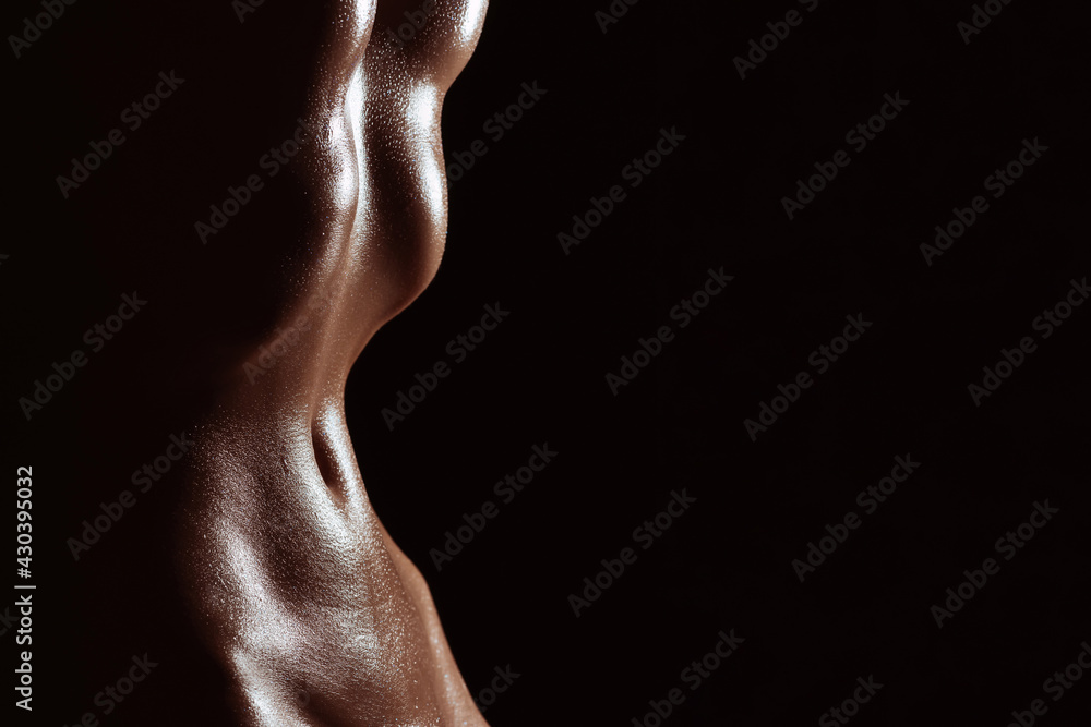 Slender waist of a naked girl. Silhouette of wet tummy in drops of sweat on a dark background